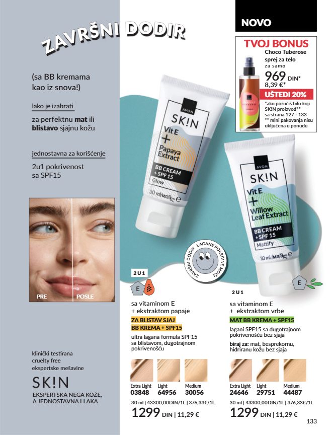 Avon Lepota ColorTrend BB krema - Lagana BB krema matira, osvežava i prekriva u samo jednom potezu nanošenja. Jednostavna za nanošenje. Brzoupijajuća formula koja može da se nosi umesto tečnog pudera. Odgovara različitim tipovima kože. Ravnomerno naneti na kožu lica. 30 ml. Light - Light Medium.